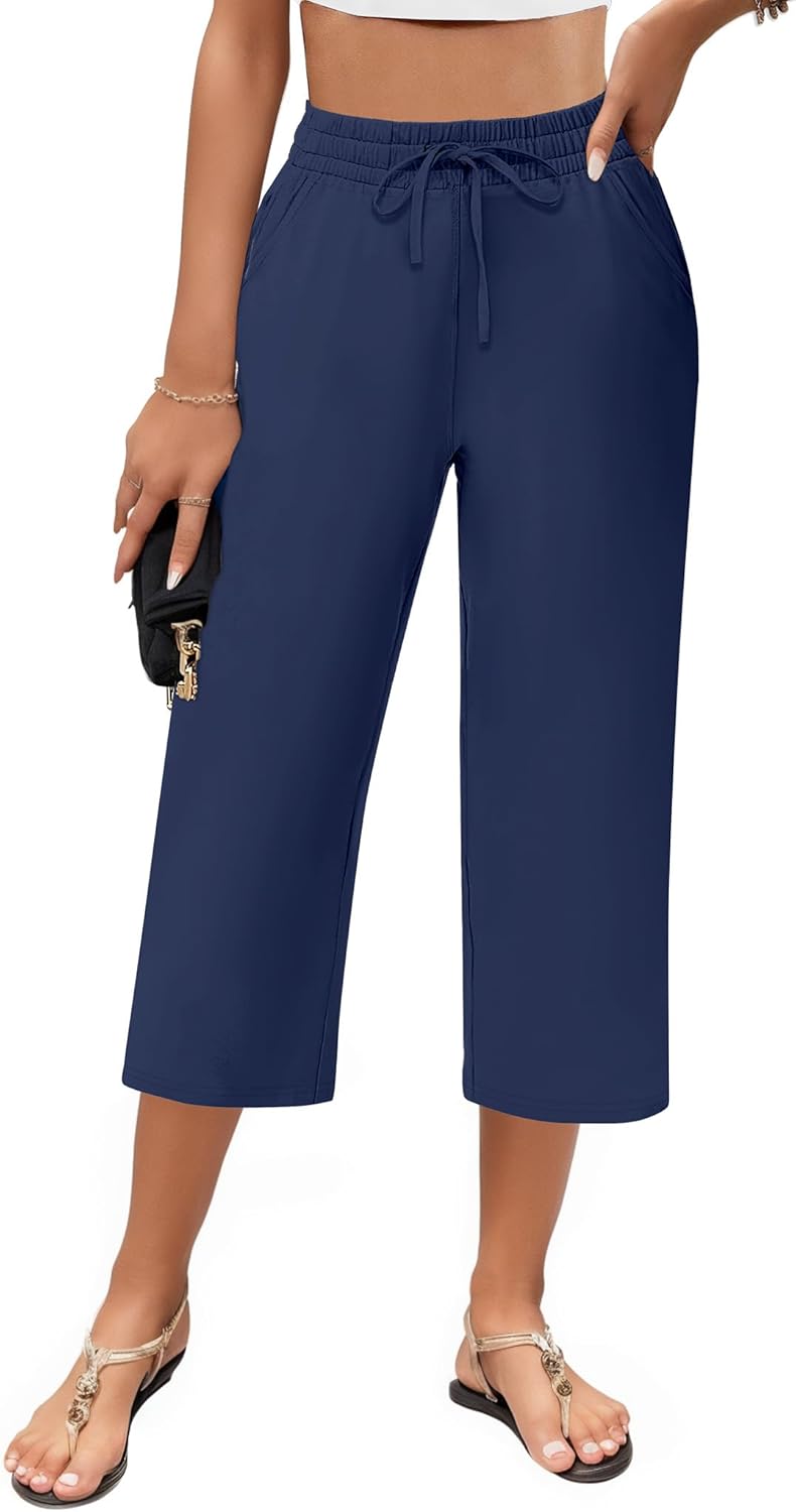 AURUZA Calça capri feminina, perna larga, com cordão, casual, com bolsos, calça capri folgada e confortável para ioga