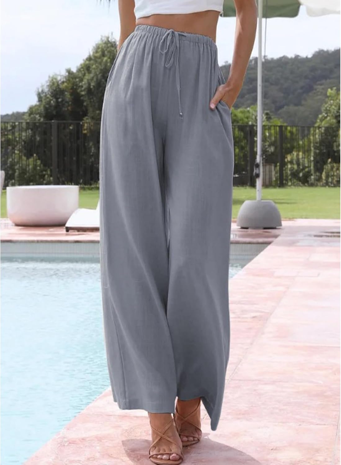 Bestgift Calça feminina grande de linho com bolso solto com cordão e perna larga