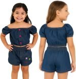 Conjunto Top e Short Jeans Infantil Menina Festa Aniversário Presente-KIDS