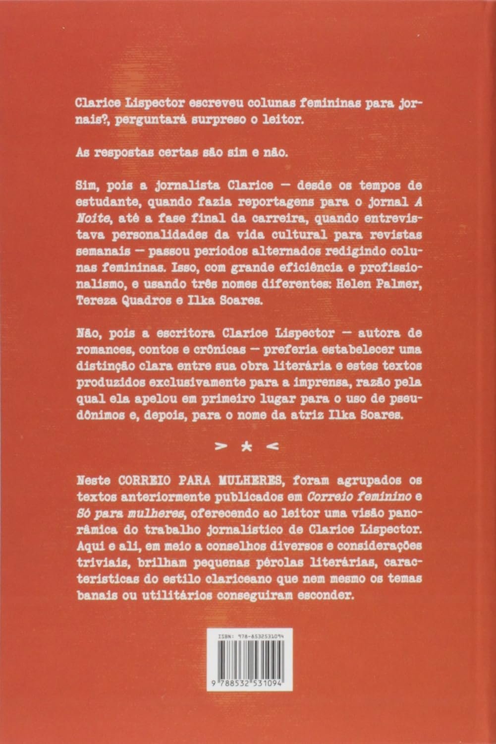 Clarice Lispector escreveu colunas femininas para jornais?, perguntará surpreso o leitor. As respostas certas são sim e não. Sim, pois a jornalista Clarice — desde os tempos de estudante, quando fazia reportagens para o jornal A Noite, até a fase final da carreira, quando entrevistava personalidades da vida cultural para revistas semanais — passou períodos alternados redigindo colunas femininas. Isso, com grande eficiência e profissionalismo, e usando três nomes diferentes: Helen Palmer, Tereza Quadros e Ilka Soares. Não, pois a escritora Clarice Lispector — autora de romances, contos e crônicas — preferia estabelecer uma distinção clara entre sua obra literária e estes textos produzidos exclusivamente para a imprensa, razão pela qual ela apelou em primeiro lugar para o uso de pseudônimos e, depois, para o nome da atriz Ilka Soares. Neste CORREIO PARA MULHERES, foram agrupados os textos anteriormente publicados em Correio feminino e Só para mulheres, oferecendo ao leitor uma visão panorâmica do trabalho jornalístico de Clarice Lispector. Aqui e ali, em meio a conselhos diversos e considerações triviais, brilham pequenas pérolas literárias, características do estilo clariceano que nem mesmo os temas banais ou utilitários conseguiram esconder.
