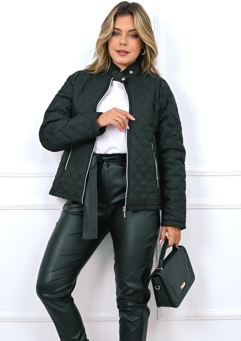 Jaqueta Feminina Forrada Corpo e Mangas Com Pelo Fleece Pelúcia Puffer Bobojaco Nylon Matelado Losangulo Acolchoado Gominho Inverno Frio