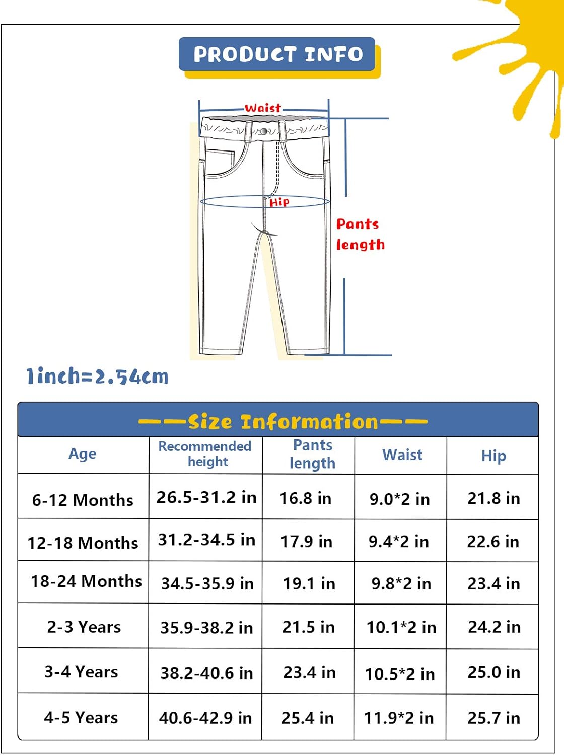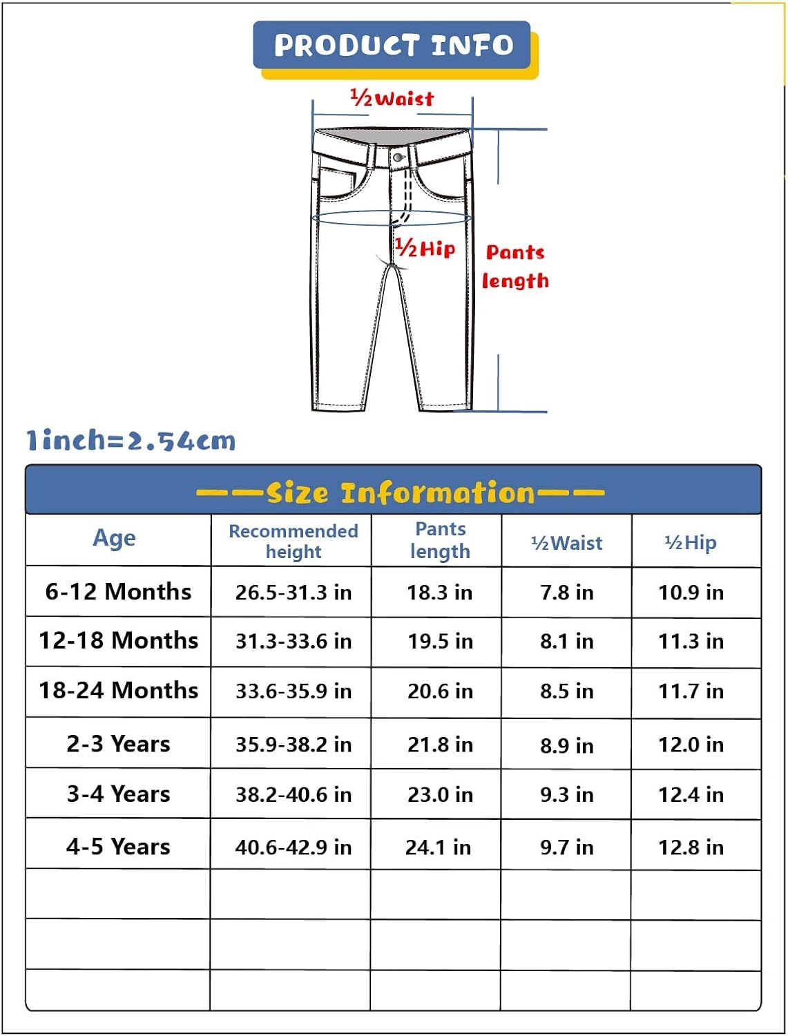 Tamanho 6-12 meses: Comprimento das calças: 16,8 pol. 1 / 2Waist: 10,1 pol. 1 / 2Hip: 9,0 pol. Altura recomendada: 26,5-31,3 pol. Tamanho 12-18 meses : Comprimento das calças: 17,9 pol. 1 / 2Waist: 10,5 pol. 1 / 2Hip: 9,4 pol. Altura recomendada: 31,3-33,6 pol. Tamanho 18-24 meses: Comprimento das calças: 19,1 pol. 1 / 2Waist: 10,9 pol. 1/2Hip: 9,8 pol. Altura recomendada: 33,6-35,9 pol. Tamanho 2-3 anos: Calças Comprimento: 21,5 pol. 1 / 2Waist: 11,3 pol. 1/2Hip: 10,1 pol. Altura recomendada: 35,9-38,2 pol. Tamanho 3-4 anos: Calças Comprimento: 23,4 pol. 1 / 2Waist: 11,7 pol. 1/2Hip: 10,5 pol. Altura recomendada: 38,2-40,6 pol. Tamanho 4-5 anos: Calças Comprimento: 25,4 pol. 1 / 2Waist: 12,0 pol. 1/2Hip: 11,9 pol. Altura recomendada: 40,6-42,9 pol.