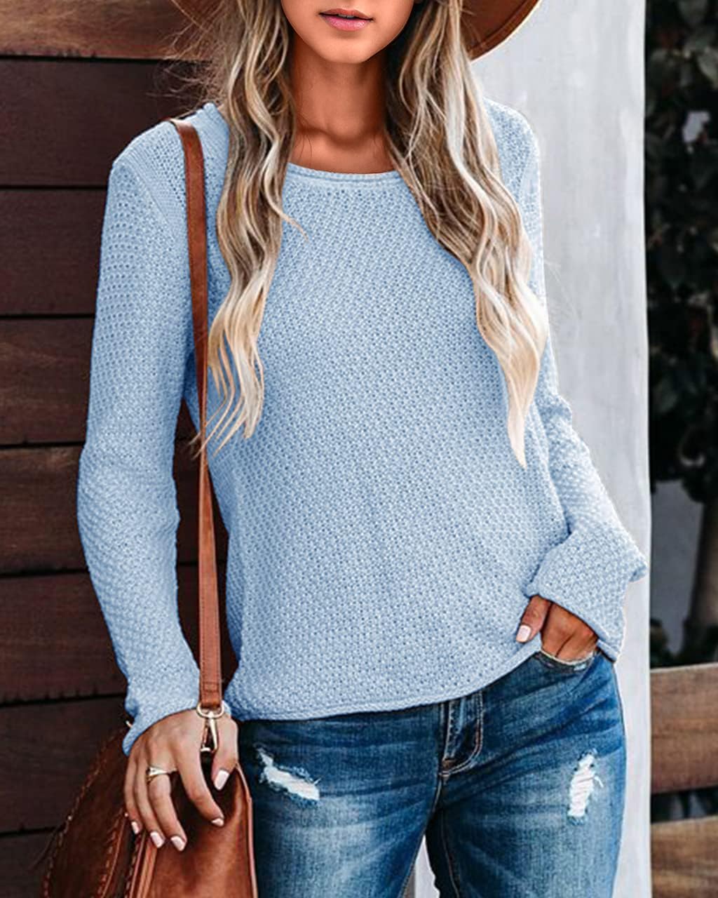 Suéter feminino com gola redonda, cor sólida, casual, quente, leve, tricotado