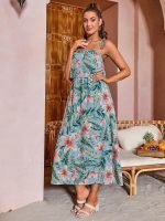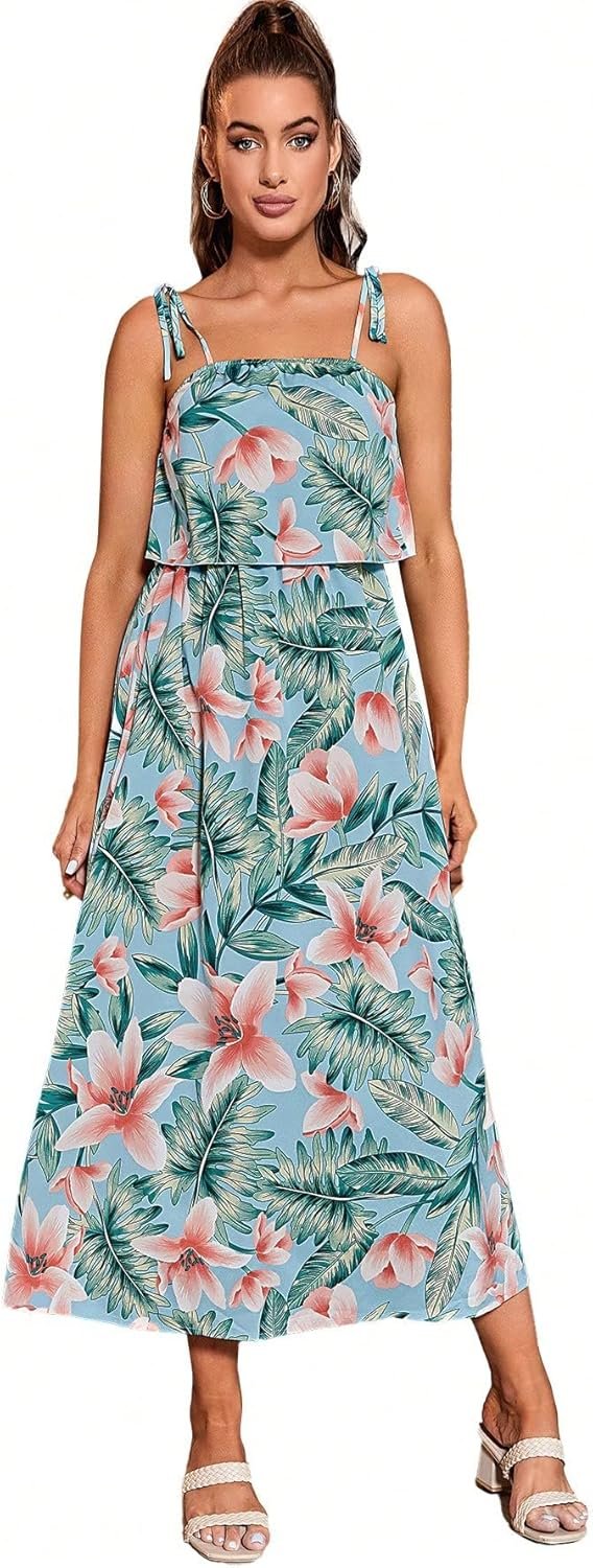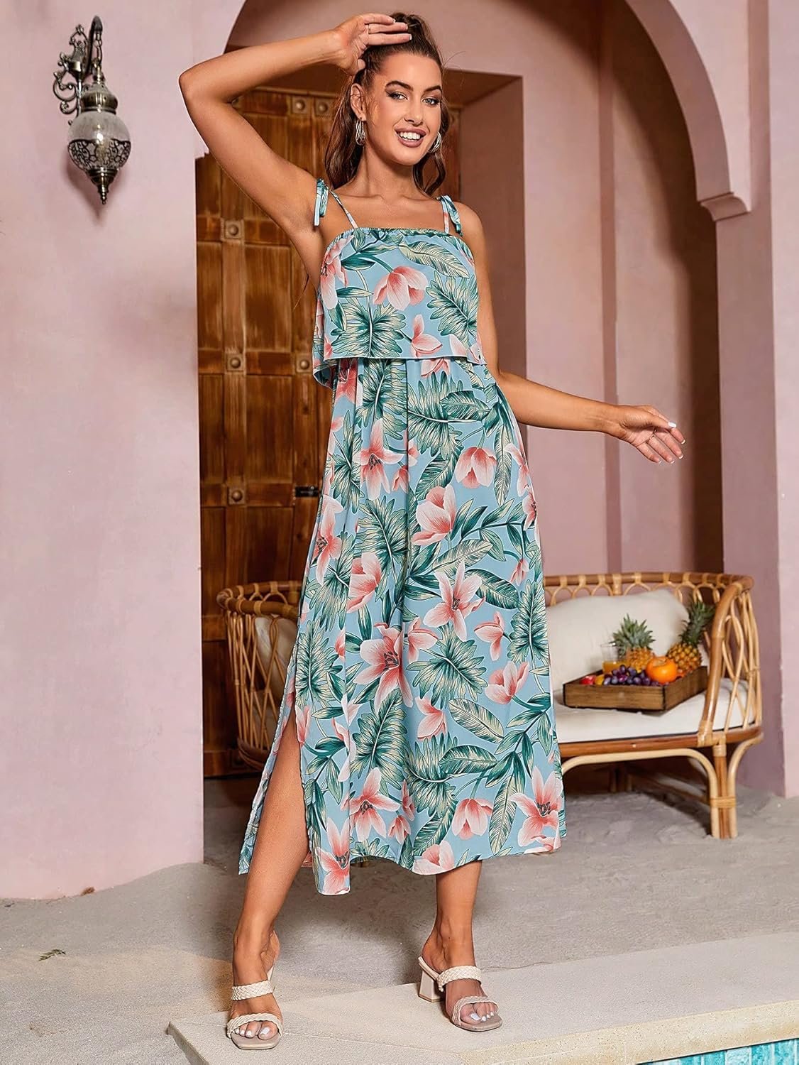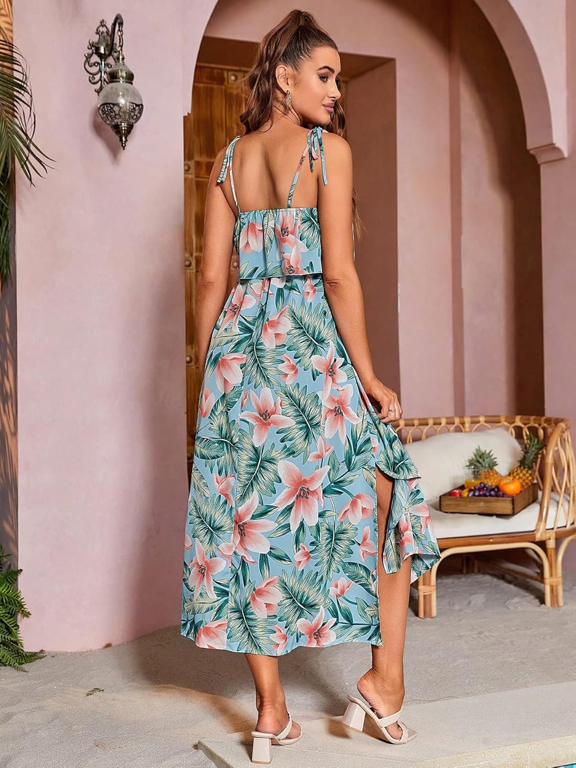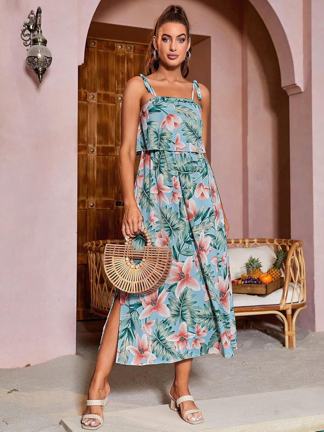 Vestido feminino floral com laço no ombro e fenda na coxa, vestido maxi para férias na praia