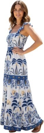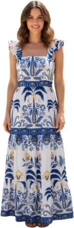 Vestido Longo Feminino Estampado Elegante Decote Quadrado